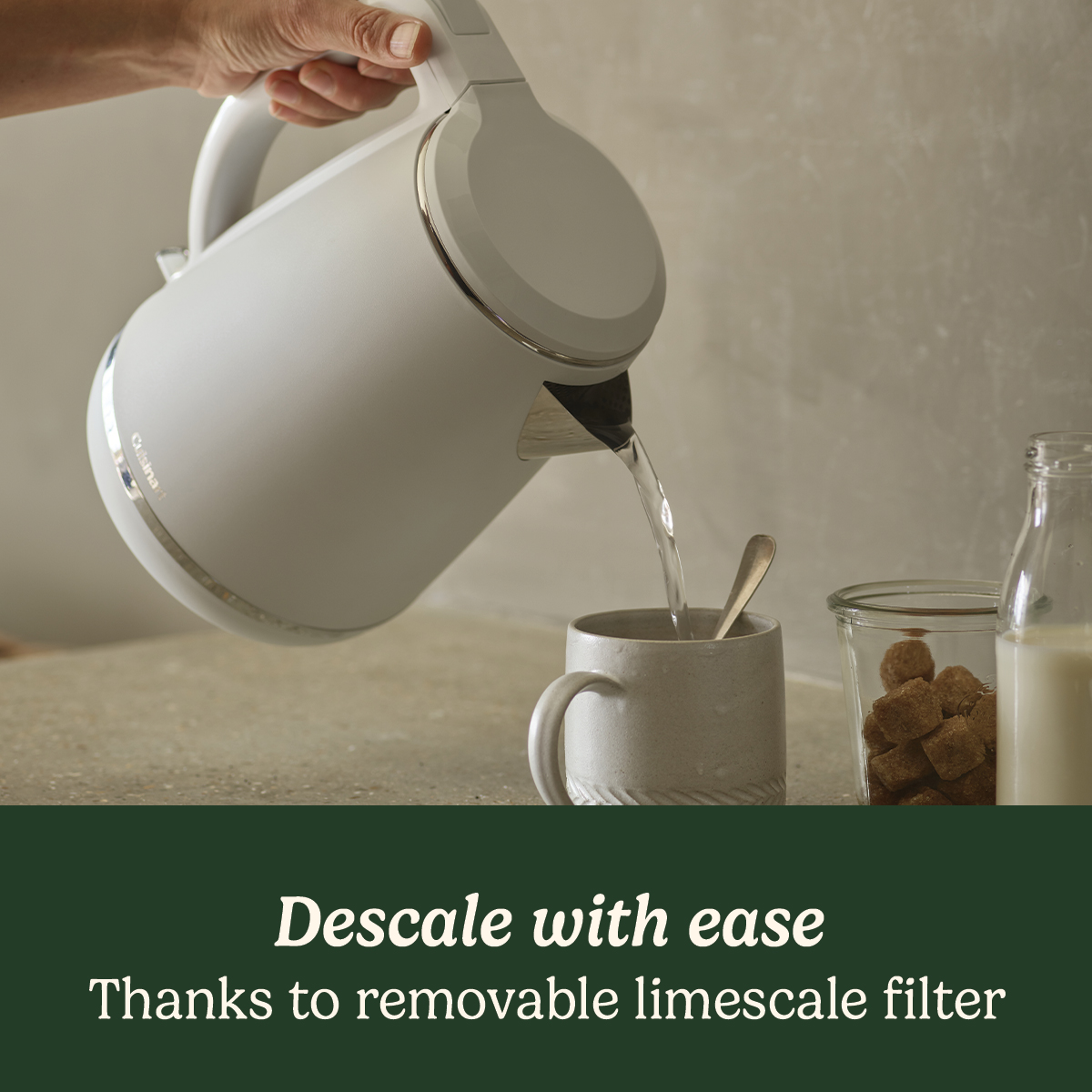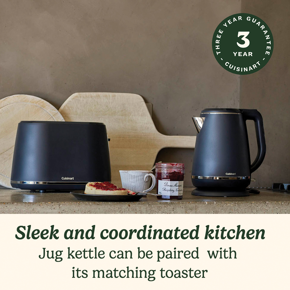 Deze eigentijdse waterkoker, in een antraciet zwarte kleur met een matte afwerking en glanzende details, zal prachtig in je keuken staan. Het heeft een volledig roestvrijstalen binnenkant en een geïntegreerd kalkfilter, wat de kwaliteit en de smaak van je drankjes verbetert. Met een vermogen van 3 kW kookt het water snel en de draaibare basis is ideaal voor links- en rechtshandig gebruik. Maak de look compleet met een bijpassende broodrooster met 2 sleuven, in dezelfde antraciet zwarte kleur en afwerking.